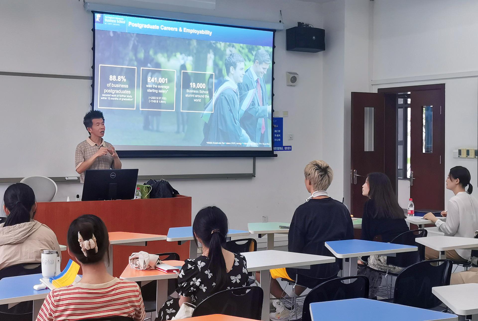 会后,诺丁汉大学Jimmy Huang一行面向漫画柜 学生开展交流宣讲。Jimmy Huang生动风趣地介绍了诺丁汉大学先进的办学理念、优美的校园环境以及丰富多彩的社团活动,让同学们对这所历史悠久、底蕴深厚的学府有了更加深刻和清晰的认识。Jimmy Huang还介绍了金融领域未来就业前景,讲解了金融科技等交叉学科的应用和市场需求。Jimmy Huang和Lily Ma与现场学生积极互动,回答了同学们关于出国留学方面的问题。