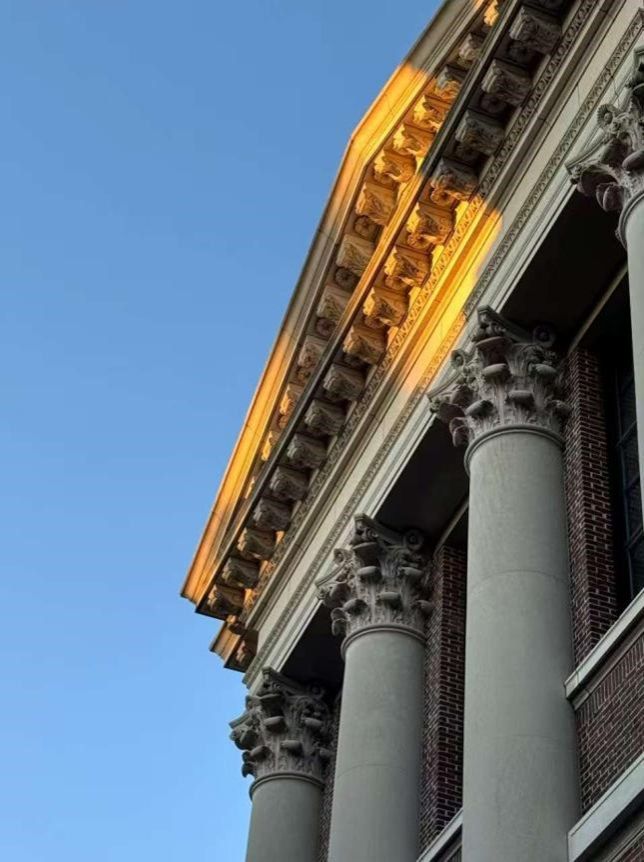 哈佛大学在查尔斯河附近,不同于MIT的现代摩登,古老宏伟的建筑群展示着哈佛大学的历史和传承。大部分暑期学校的课程教室都安排在Harvard Yard,它是哈佛大学的主校区。这里,楼房高矮胖瘦,斑驳的红砖墙和暗沉的大理石相衬,几条碎石小径划分出通往各处的要道,大片泛着光的草坪变成拼图散落各处,镌刻着“真理”(veritas)的徽章随处可见,游客行人络绎不绝。庄严肃穆的背景,藏不住氤氲着的蓬勃生机与活力。