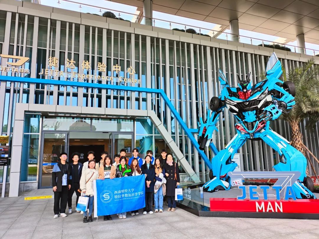 在体验中心,讲解员为师生详细介绍了成都分公司及捷达品牌的发展历史。随后,师生们满怀期待地乘坐观光车进入车间参观,沉浸式体验德系工艺。同学们参观了总装车间和焊装车间,了解了从零部件到整车的华丽蜕变,也感受到了现代制造业“智能化”的魅力。焊装车间采用德国大众最先进的VASS电气标准设计,自动化率超过90%,自动化的检验设备可实现车身制造过程的100%监控,超声波无损检测替代传统检测。一汽大众引以为荣的智能化激光焊接技术更是让大家大开眼界,感叹科技的强大。