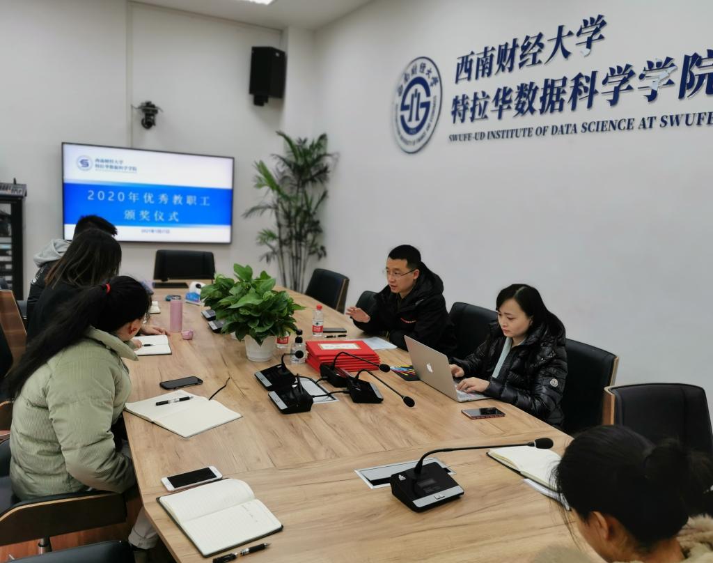 2020年度优秀教职工表彰会议在格致楼视频会议室111举行,学院教职员工参会。综合行政办公室刘晓娜老师主持会议。