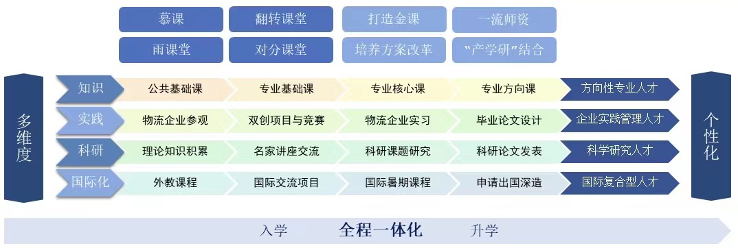 学院根据国家“新文科”指导思想和要求,紧跟物流业发展趋势,从课程体系安排、教学方法手段、科研反哺教学、社会实践活动、名家讲座交流、成效评价机制等方面入手,不断优化人才培养方案,逐步形成“全程化、多维度、个性化”人才培养模式。
