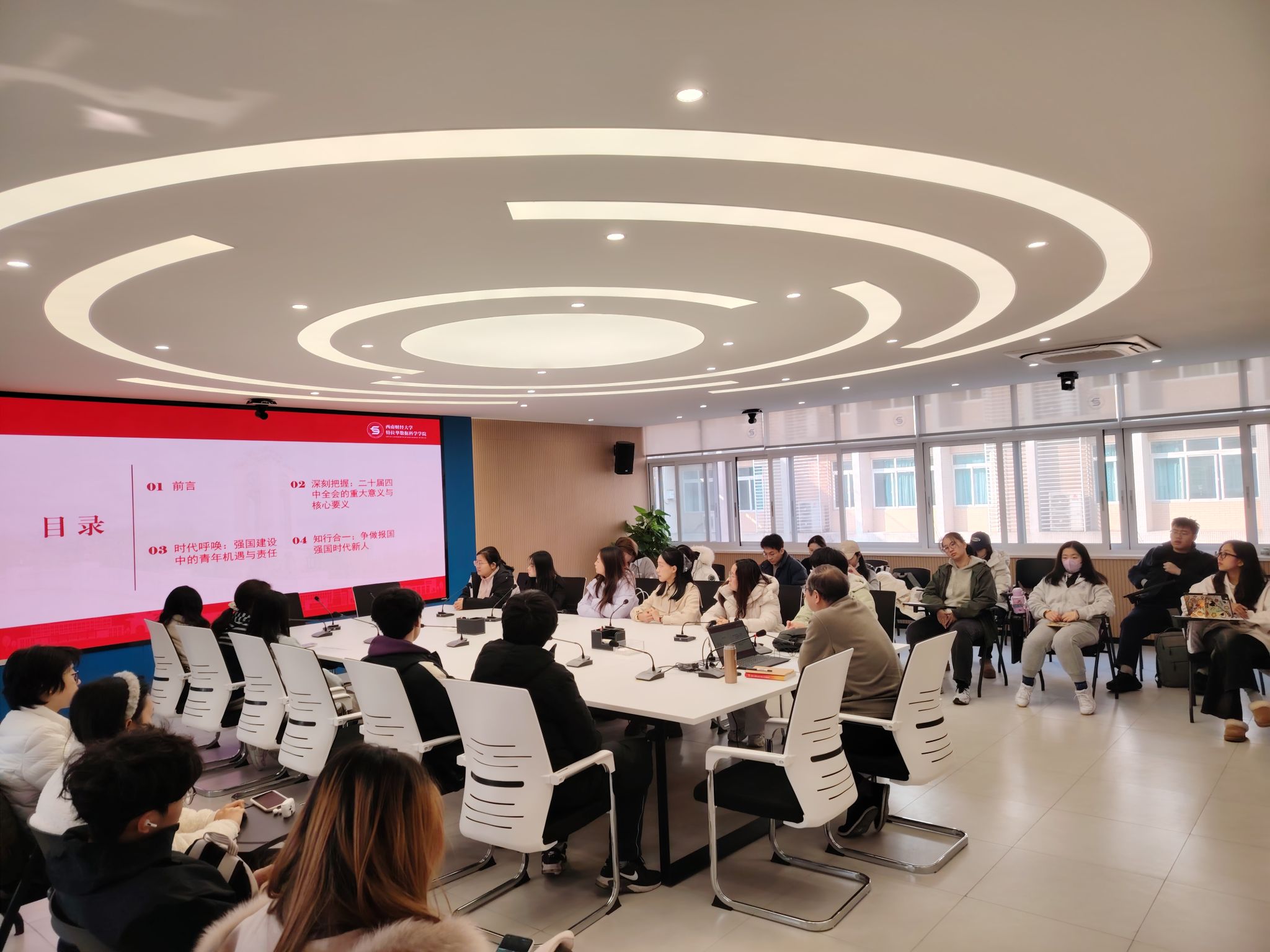 2025年1216日,学院党总支书记王新海在通博楼D207会议室以学习领会党的二十届四中全会精神,争做报国强国时代新人为题,为学院本科生讲授思政课,引领青年学子准确把握国家发展大势,自觉将个人理想追求融入党和国家事业之中。