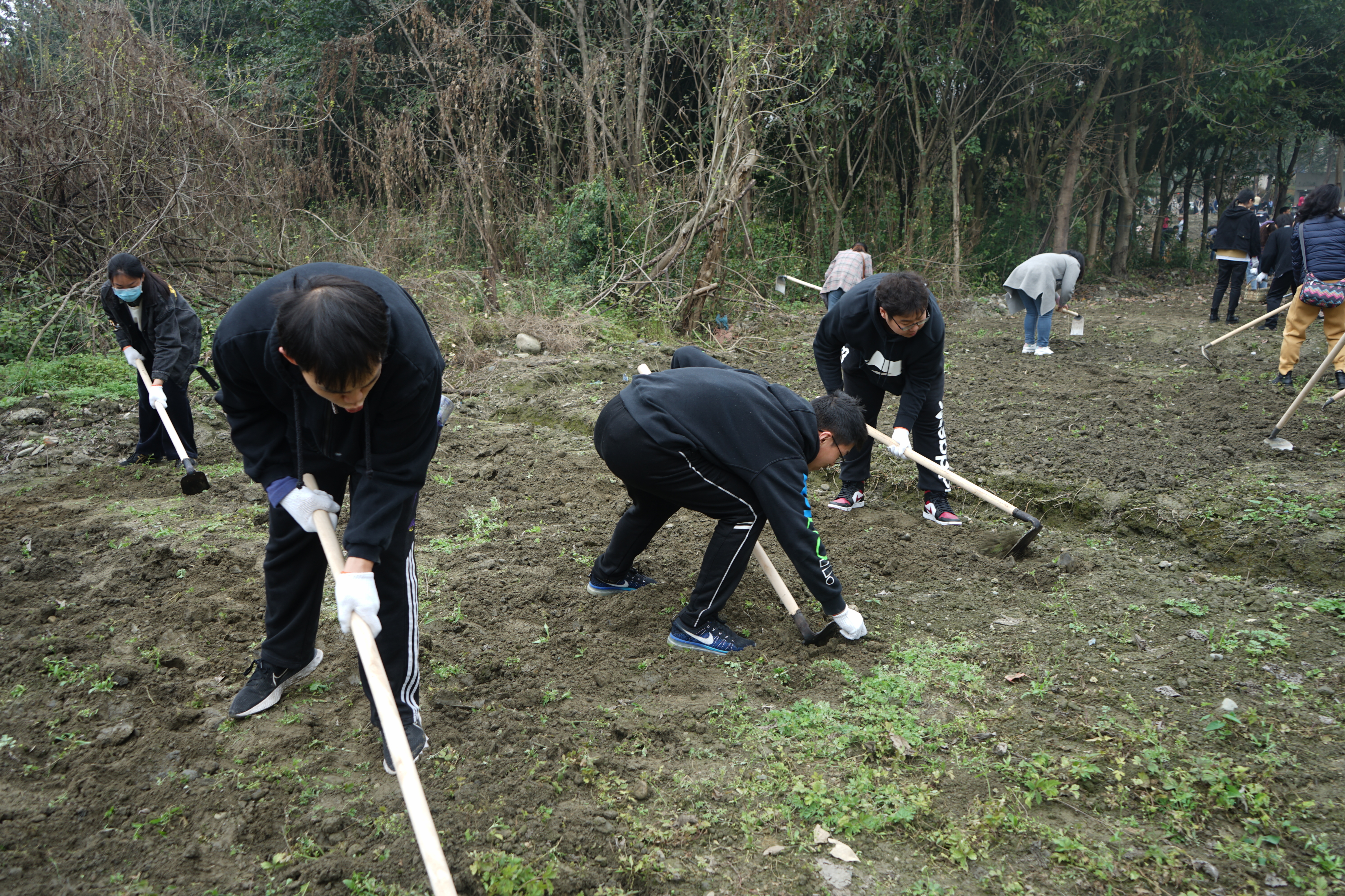 学生在“数据伊甸园”耕地里,齐心协力,分工合作,挖地,除草、松土。党委书记赵德武到漫画柜