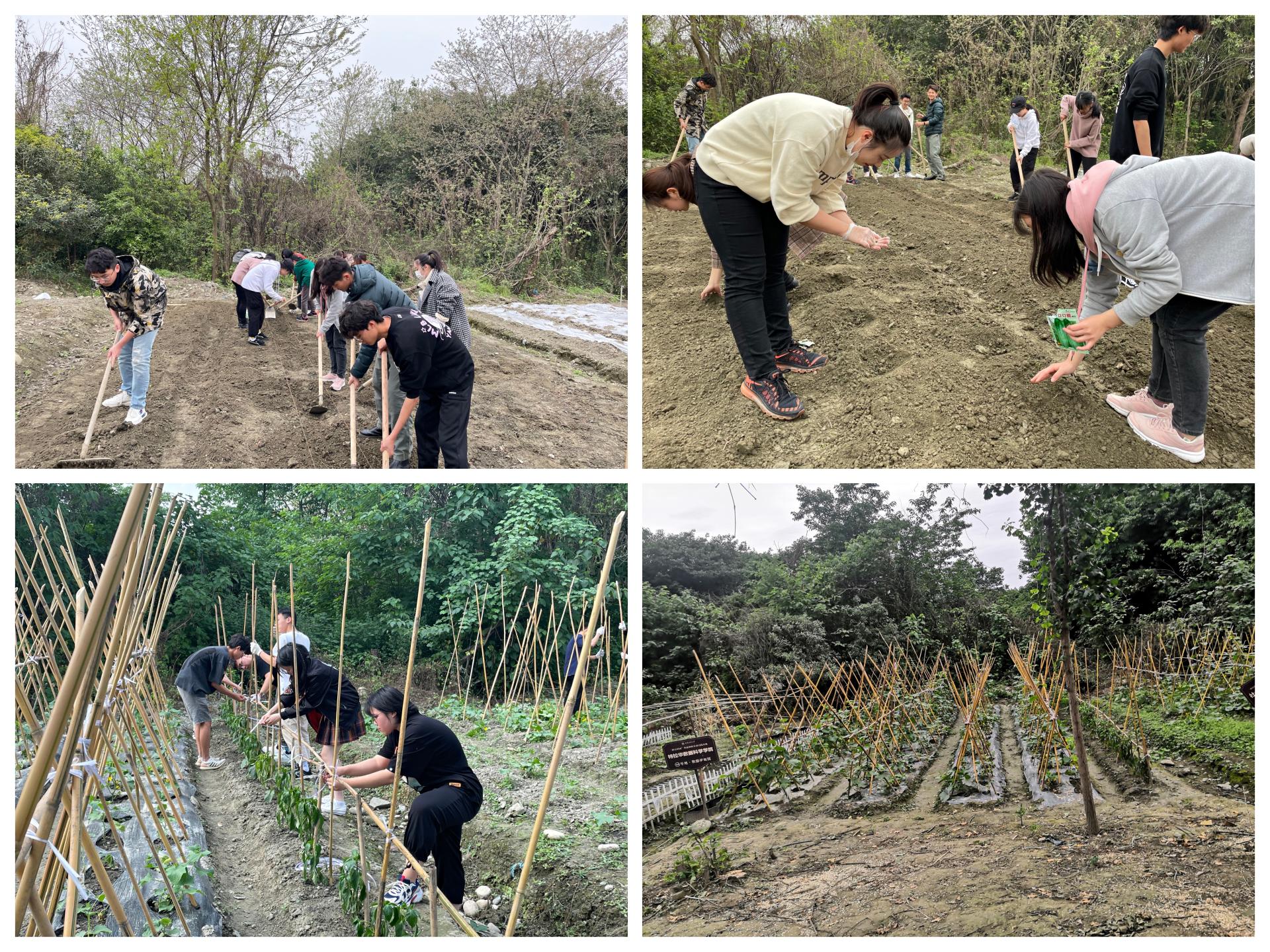 小组成员在学校后勤师傅的指导下完成了播种、盖膜、搭架子,在组长的带领下,同学们每周都坚持去种植地查看幼苗生长情况,松土、除草、收拾树枝残叶,监控土壤质量,保障幼苗苗生长所需水分、氧气、阳光等营养条件。