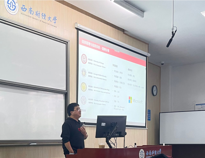 胡少飞老师以“人生抉择之再次崛起”为主题,详细为同学们讲解了大学的生涯规划。胡老师首先从特拉华数据科学院中美双学位背景优势、三大交叉专业的优势、西财商科专业国际认可度高等方面,帮助同学们深入了解了学院优势,紧接着通过数据对比,详细为同学们讲解了保研、考研、出国留学的要求,旨在帮助同学们明确自己的目标,更深刻的认识职业生涯规划。