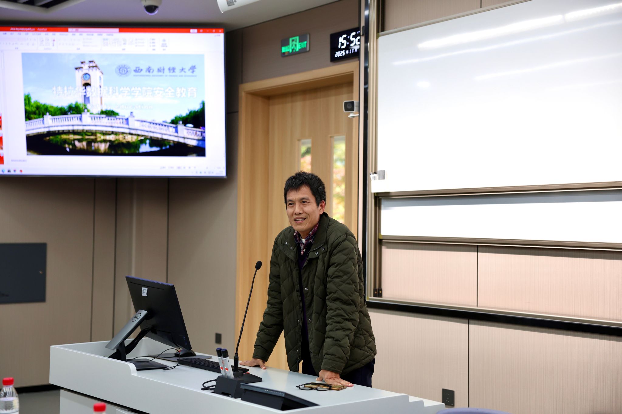 罗松涛就“消防和治安安全教育”进行宣讲。他提到,2025年11月9日是第34个全国消防日,今年消防宣传月的主题为“全民消防、生命至上——安全用火用电”。针对校园作为人员密集场所的特点,他重点讲解了常见火灾隐患,并配以大量实景图片,直观展示学生日常生活中可能存在的错误用电行为。